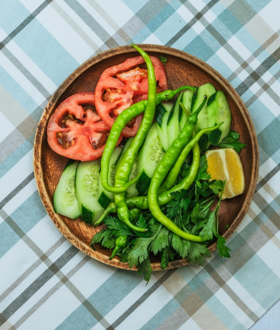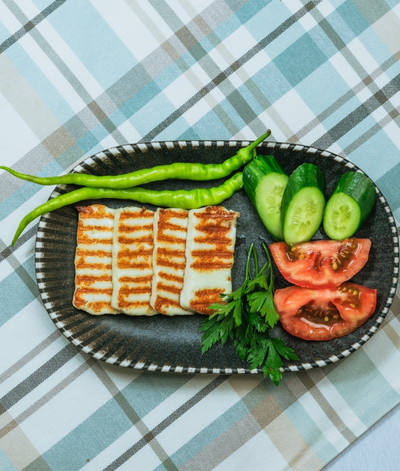 Tomato, Cucumber, Parsley, Roasted Red Pepper, Black Olives, Crackers, Honey & Cream Milk Jam and Fried Egg